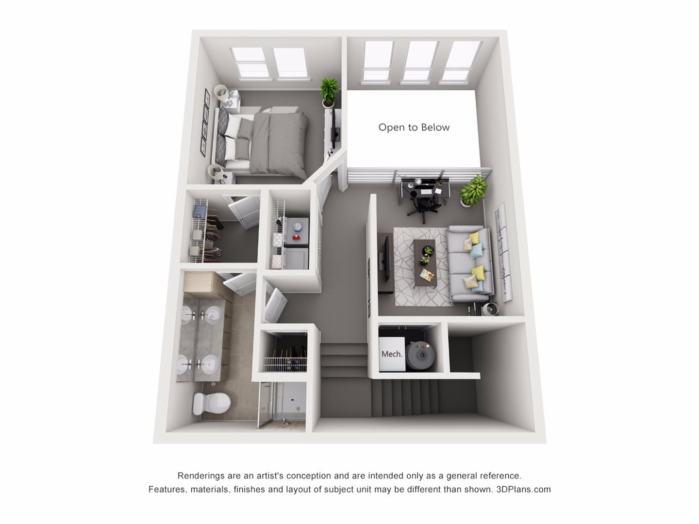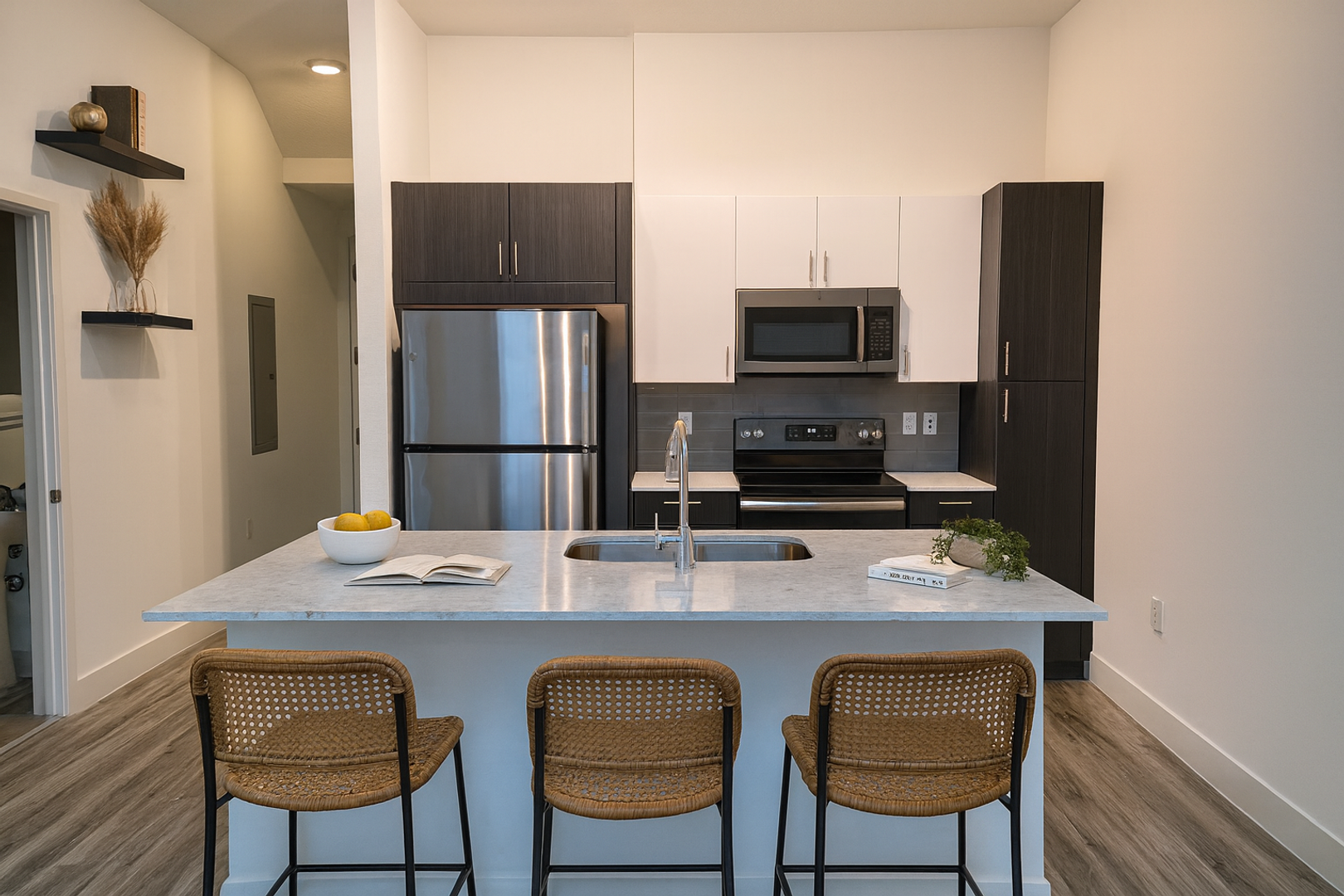 Industrial Chic: High ceilings, open floor plan, modern urban aesthetic.