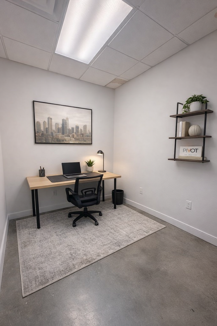 This private 80-square-foot interior office is a smart, efficient workspace designed for focus and productivity. The office comes fully furnished with a desk and chair, making it move-in ready from day one. Ideal for individuals or remote professionals who need a quiet, dedicated space within a collaborative environment. A great option for those looking for privacy without excess space.